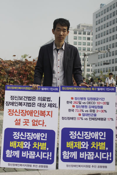 특히 지난해부터는 ‘정신건강증진 및 정신질환자 복지서비스 지원에 관한 법률’ 제정을 위한 일인시위를 광화문, 국회에서 전개 2016년 19대 국회 마지막날에 법안을 통과 시키는등 정신장애인들의 권리 옹호를 위한 활동에 힘써왔다.
