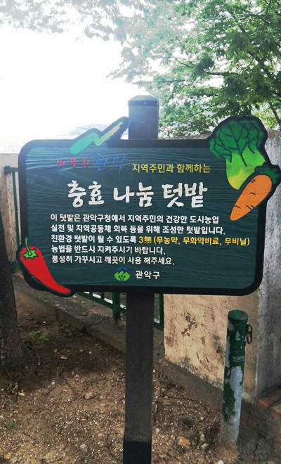 관악구에는 충효 나눔 텃밭 외에도 강감찬 텃밭과 낙성대 텃밭 등이 친환경 도시텃밭으로 개장되어 있습니다. 텃밭 가꾸기를 통해 건강하고 푸르른 관악구로 거듭나길 희망합니다.