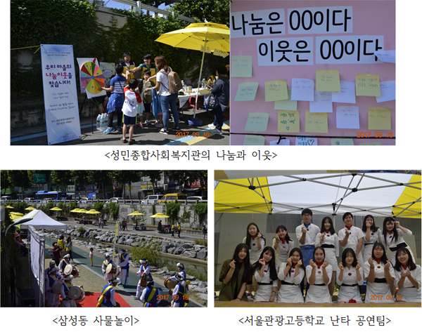 ‘공유야! 놀자!’ 어떻게 공유하며 놀고 있는지 삼성동 시장 앞 도림천변을 찾았다. 참여단체들은 분주히 천막을 치고, 자원봉사자는 의자와 탁자를 나르며 도와주고 있다. 삼성동사물놀이의 징과 장구 등 조화로운 소리와 서울관광고등학교 학생의 난타공연에 도림천변은 주민들의 공유축제가 시작되었다. ‘성민종합사회복지관’의 『우리 마을의 나눔이웃을 찾습니다!』 코너에 눈길이 갔다. [나눔은 00이다. 이웃은 00이다.] 포스트잇으로 붙여놓은 곳을 유심히 보니“나눔은 행복, 사랑, 기쁨이고, 이웃은 반가움, 친구, 사랑이다”고 표현했다. 참으로 뜻깊었다.