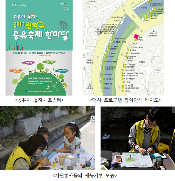 지난 9월16일 토요일 11시. 공유문화 확산을 위한 『공유야 놀자~ 2017 관악구 공유축제 한마당』의 장이 열렸다. ‘삼성동 자원봉사캠프’ 등 32개 단체가 참여했다. 주민들과 함께 소통하며 즐겁게 체험할 수 있는 공유의 장이 마련되었다. 이날 행사는 지난 6월24일 개최한 이후 두 번째 행사로 관악구청 기획예산과와 공유공동체 ‘싹난지팡이’ 주관으로 진행했다.