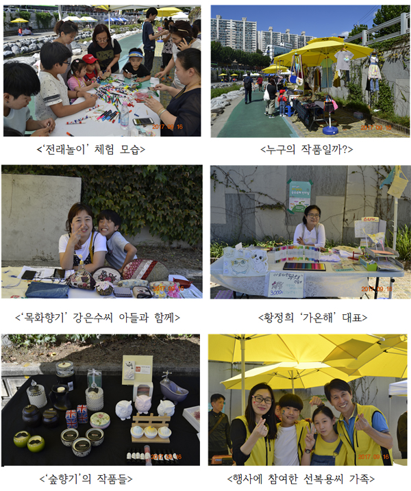 이번 행사 프로그램에 참여한 단체를 4단계 나눔<표 1>으로 분류하였다. 창작과 공예 나눔, 놀이와 체험 나눔, 재능과 봉사 나눔, 물건과 먹걸이 나눔이다. 특히 자원봉사자들의 재능 나눔은 축제분위기를 아름답게 꽃을 피워주었다. 행사 프로그램에 참여단체 중 ‘창작과 작품 나눔’의 단체들이 모꼬지(우리말, membership training)예술마을 팀이다. 손으로 만드는 것은 무엇이든 가능하다고 한다. 배우고 싶다면 홈페이지<http://cafe.naver.com/gamsung1004>를 방문하면 된다. 주관은 ‘싹난지팡이’에서 진행한다.