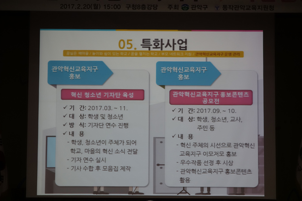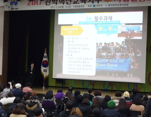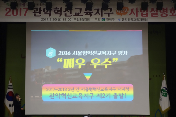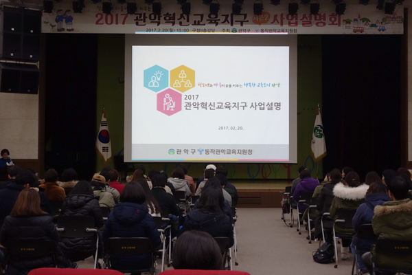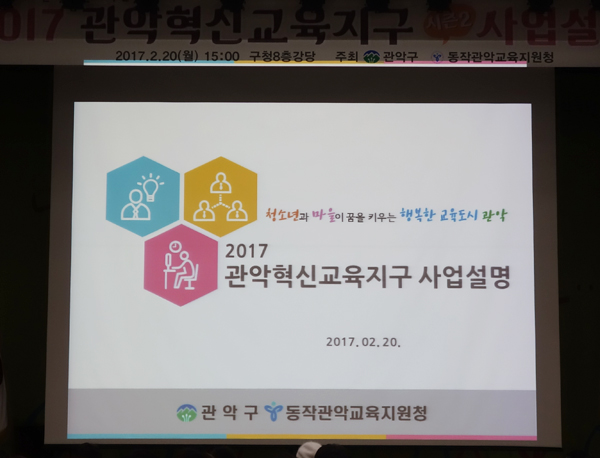 2017년 관악혁신교육지구 2기가 새롭게 발걸음을 내딛습니다. 관악구에서 펼쳐질 혁신교육지구 사업에 대한 설명회가 열렸습니다. 지난 2월 20일 오후 3시 관악구청 8층 대강당에 청소년과 마을이 꿈을 키우는 이 사업에 관심 있는 주민들이 한자리에 모였습니다.