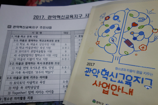 관악혁신교육지구는 2015~2016년 서울형혁신교육지구로 지정되어 1기를 성공적으로 운영하였습니다. 서울형혁신교육지구는 모두에게 신뢰 받는 공교육 혁신을 이루기 위해 교육청, 서울시, 차치구, 지역주민이 참여하고, 지역사회와 학교가 협력하여 새로운 모델을 실현하도록 서울시와 교육청이 지정하여 지원하는 자치구를 말합니다. 마을과 학교가 어우러지는 교육공동체, 놀이와 쉼을 통해 꿈과 미래를 키우는 관악의 교육, 관악혁신교육의 공동비전과 설계 마을과 학교가 함께하는 관악형 거버넌스 모델 구축이 관악혁신교육지구의 운영비전입니다.